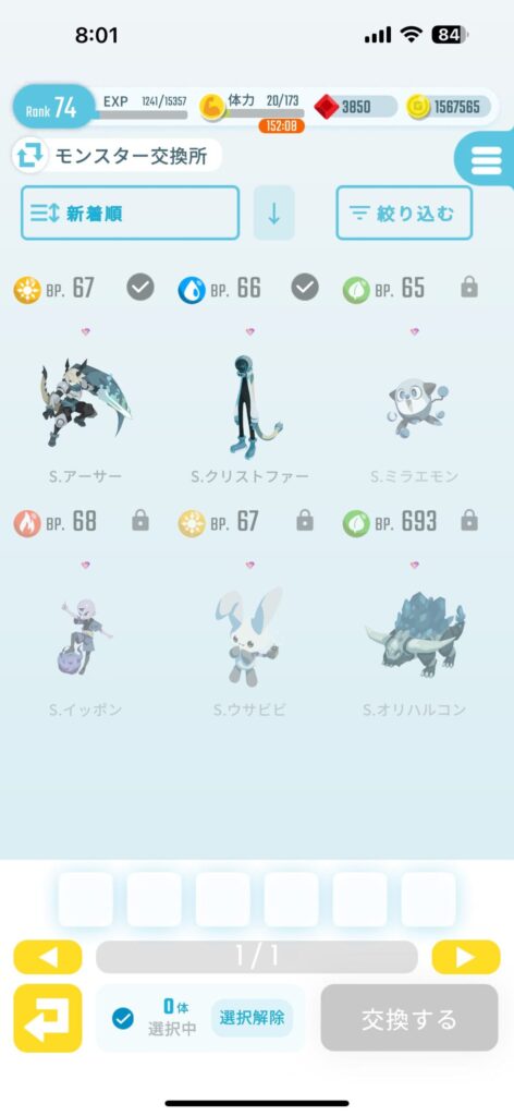 以前、紹介し忘れてました。Sモンっていうのがいるんですけど、この子たちは交換に使ったりも出来るんですがレアモンのスキルをそのまま持ち合わせている廉価版レアモンな子たちなんですね。
